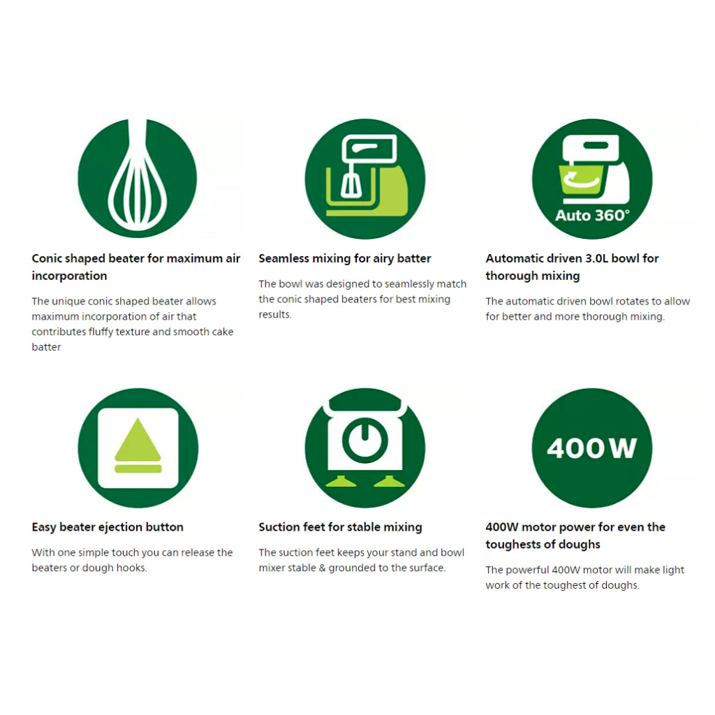 The unique conic shaped beater allows maximum incorporation of air that contributes fluffy texture and smooth cake batter