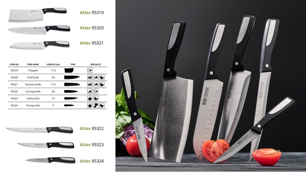 The collection of knives from the Atlas series offers you the very latest in knife design. Everything has gone into making sure that our blades are crafted to give you ultra-precision in the kitchen. All our knives are handmade using the classical technology of special hardened steel (X30CR13 / 1.4028). As a result, you can rest assured that this Atlas range offers you knives that will continue to be effective, no matter how often you use them.