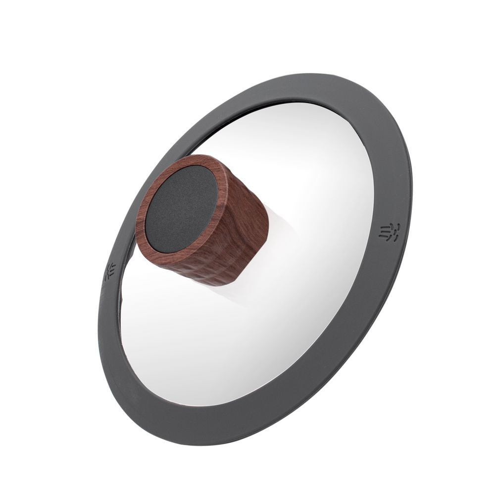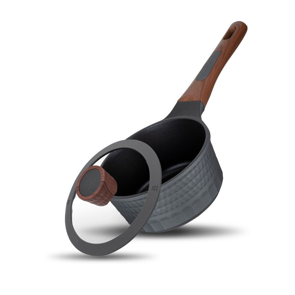 Internal non-stick coating Unique body design (3D effect) Ergonomic wood-grain soft-touch handle with a hanging loop Glass lid with a steam hole The bottom of the pan is reinforced with an anti-deformation disk Induction (suitable for all types of cookers)