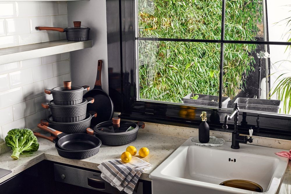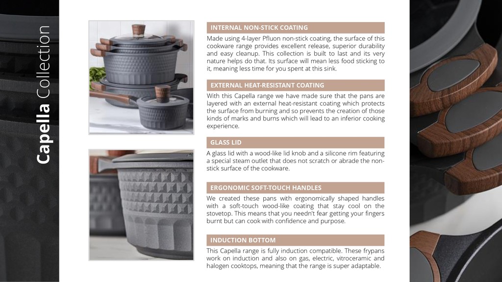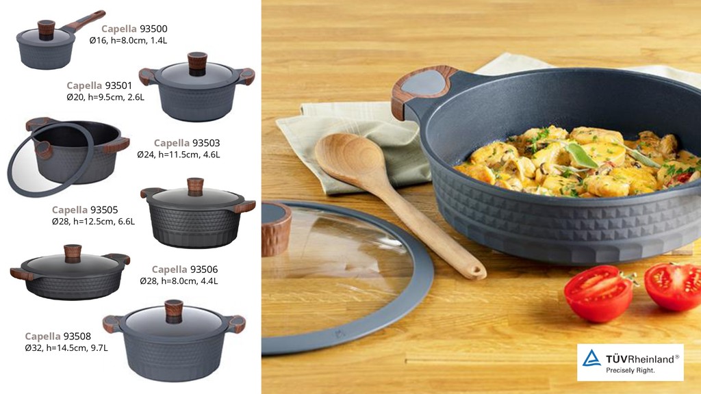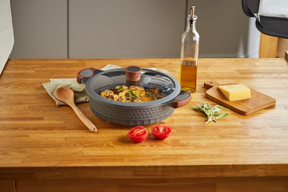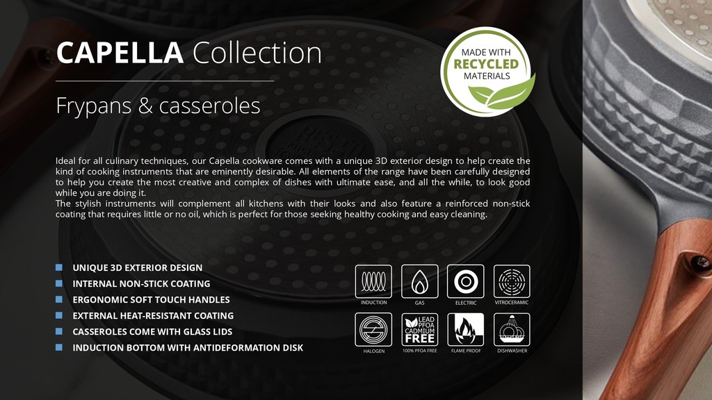Internal non-stick coating Unique body design (3D effect) Ergonomic wood-grain soft-touch handles Glass lid with a steam hole The bottom of the pan is reinforced with an anti-deformation disk Induction (suitable for all types of cookers)