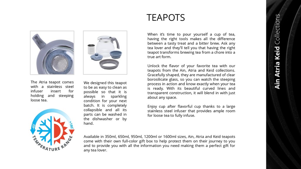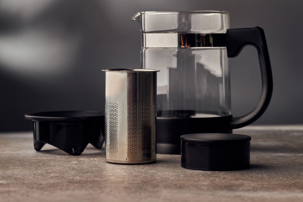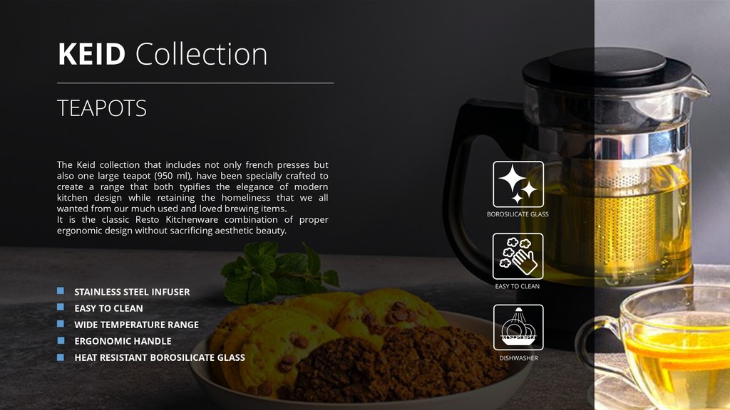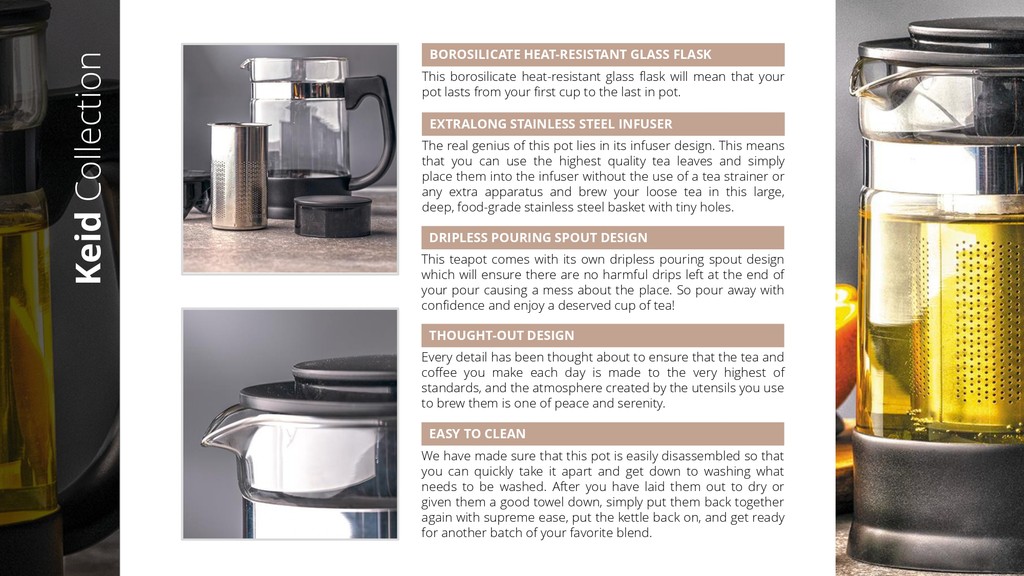 This ingeniously designed teapot helps marry the old world of tea drinking with the cutting edge of modern design. Gone will be the days of dealing with strainers or with pulling tea leaves out from between your teeth. This design will make instead for many an enjoyable pot to accompany a working day or a lazy afternoon. Made from clear, heat-resistant borosilicate glass this Keid teapot benefits from a well-designed pouring spout, stylish plastic lid, originally shaped handle and features an extra-long stainless steel infuser. With a generous 950ml capacity it is the perfect size for tea with a friend or going solo. So no matter the occasion, know that you can rely on this Keid pot going forward for your tea drinking future!