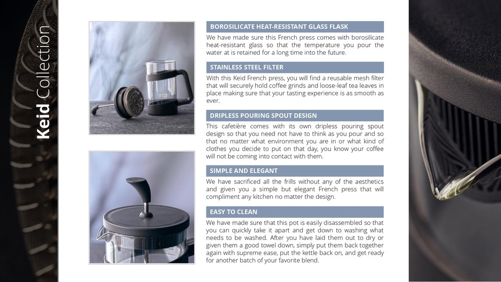 We all know one problem when brewing tea or coffee that we are all trying to avoid is making sure we're not left with large pieces of grinds or leaves in our brew at the end. There are many ways to help avoid this kind of eventuality from occurring but perhaps none more effective than what you find here. With this Keid french press, you will find a reusable mesh filter that will securely hold coffee grinds and loose-leaf tea leaves in place making sure that your tasting experience is as smooth as ever.