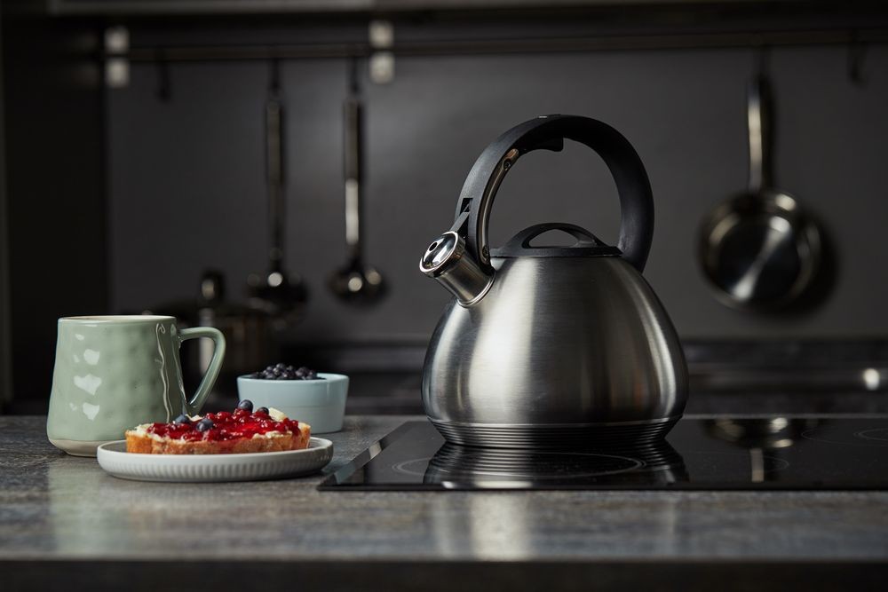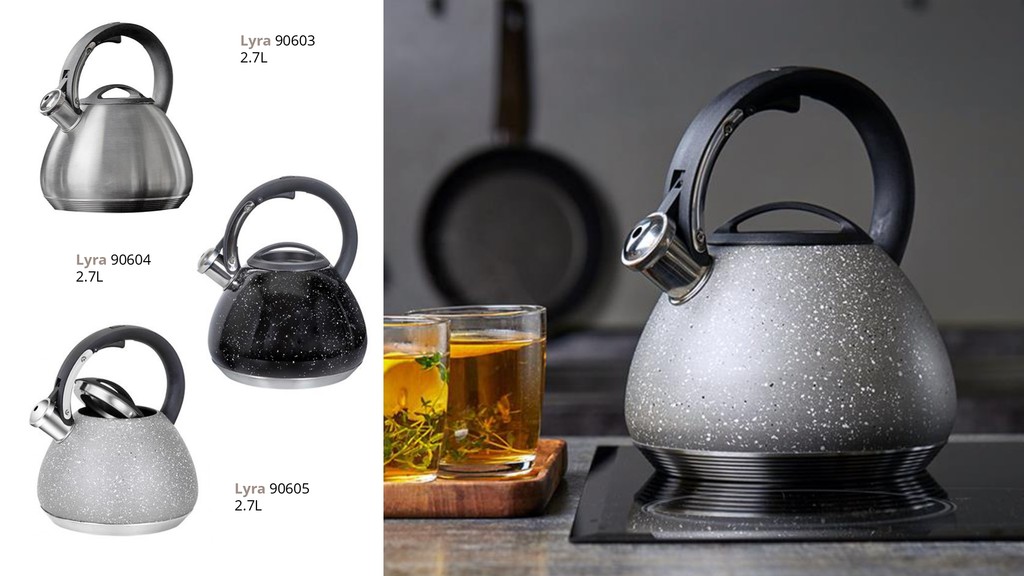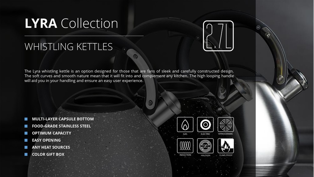 The Lyra whistling kettle is an option designed for those that are fans of sleek and carefully constructed design. The soft curves and smooth nature mean that it will fit into and complement any kitchen. The high looping handle will aid you in your handling and ensure an easy user experience.