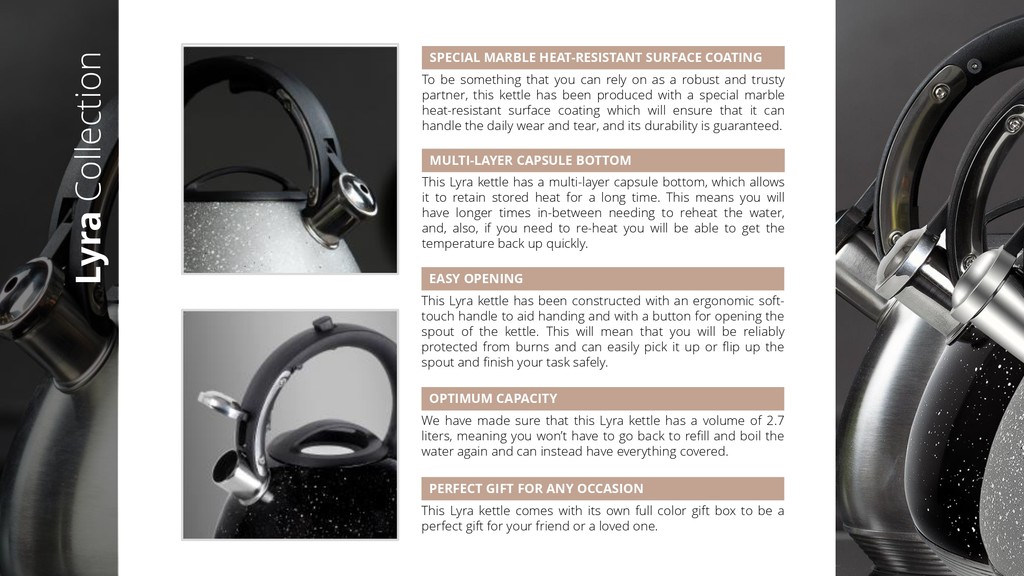 This Lyra kettle comes with its own full color gift box to help protect it on its journey to you and to provide you with all the information you need so that you can have the best possible experience. What’s more, it can be a perfect gift for your friend or a loved one.