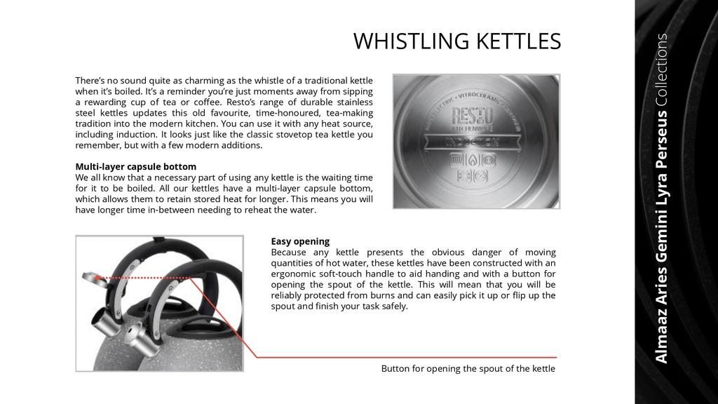 Because any kettle presents the obvious danger of moving quantities of hot water, this Lyra kettle has been constructed with an ergonomic soft-touch handle to aid handing and with a button for opening the spout of the kettle. This will mean that you will be reliably protected from burns and can easily pick it up or flip up the spout and finish your task safely.