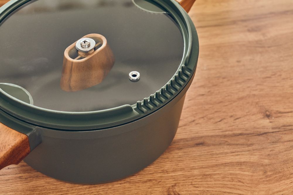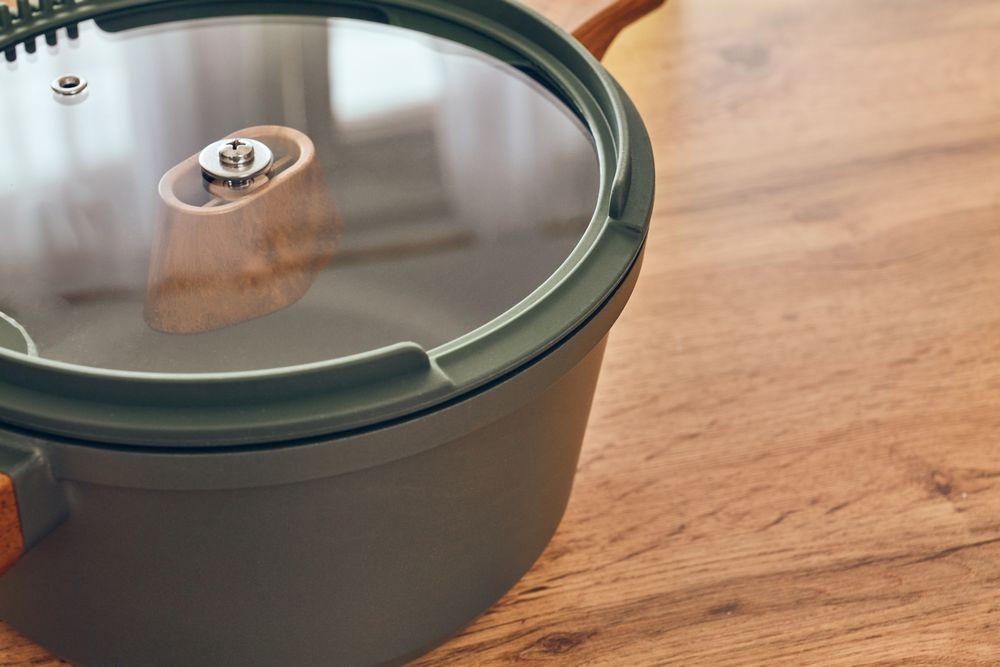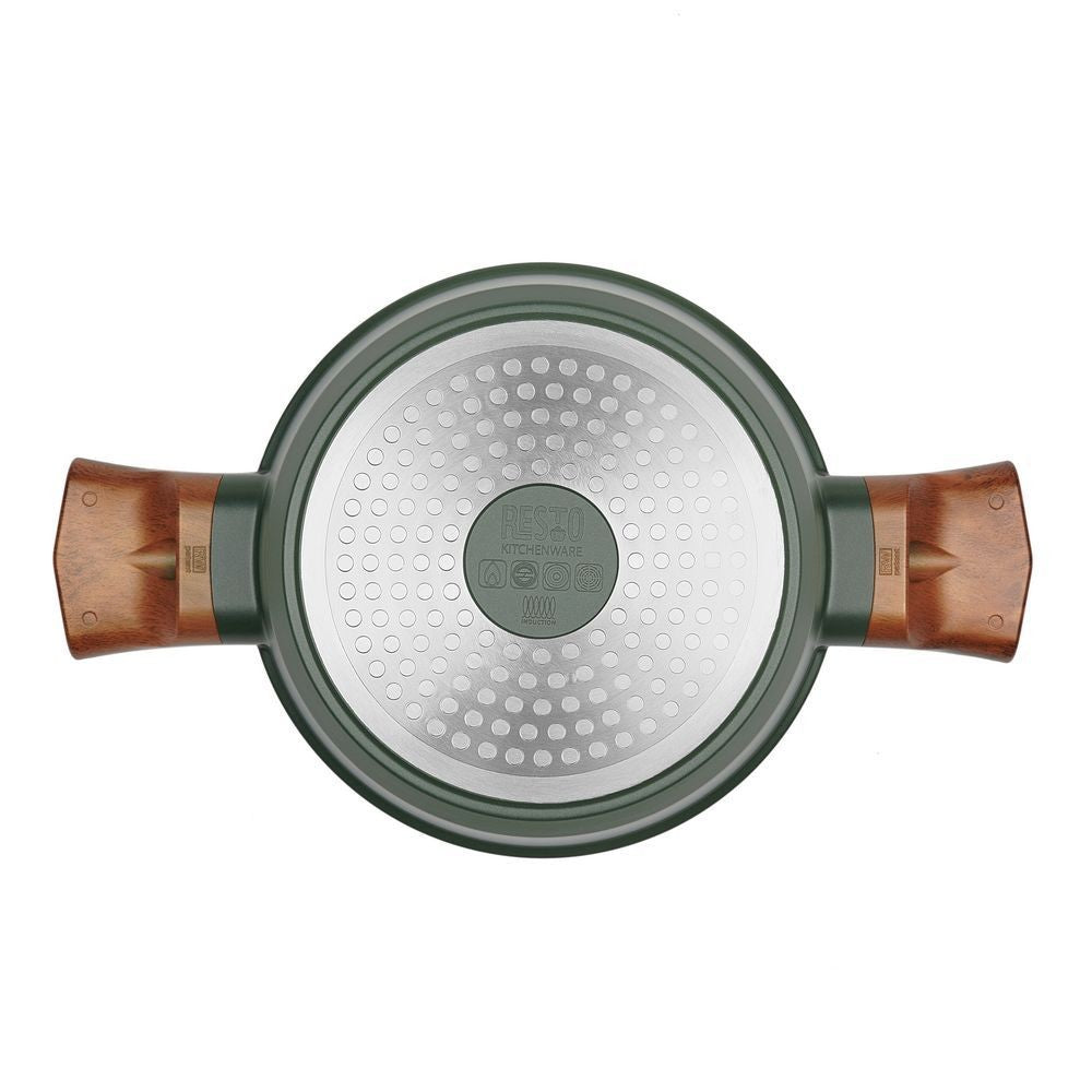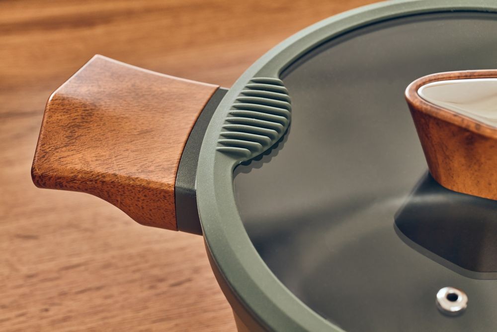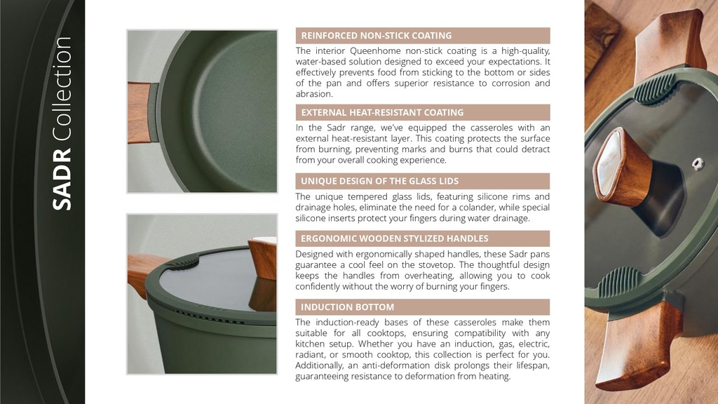 Crafted from die-cast recyclable aluminium Internal non-stick coating Queenhome External heat-resistant coating Ergonomic wood-grain handles Glass lid with silicone rim and double-sided drain features silicone inserts to protect fingers when draining water The bottom of the casserole is reinforced with an anti-deformation disk Induction (suitable for all types of cookers)