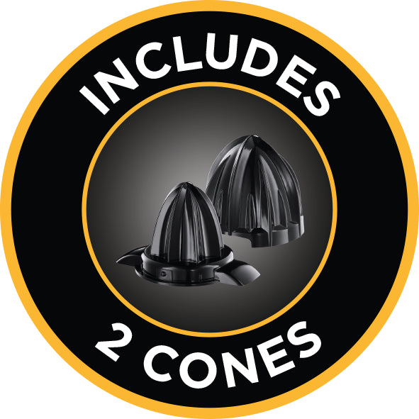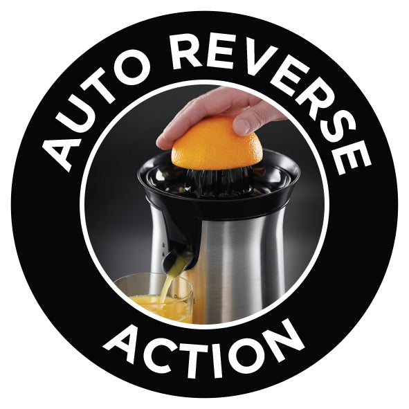 With its rotating juicing cones, extracting the juice of large and small fruits is quick and easy. The juicing cone rotates automatically as soon as the fruit is applied, so there's no need to waste time squeezing by hand. With auto-reversing action, the cone is designed to extract the maximum amount of juice with the minimum fuss and mess. Best of all it comes with two interchangeable cones; a small one for lemons and limes and a larger one for oranges and grapefruits.