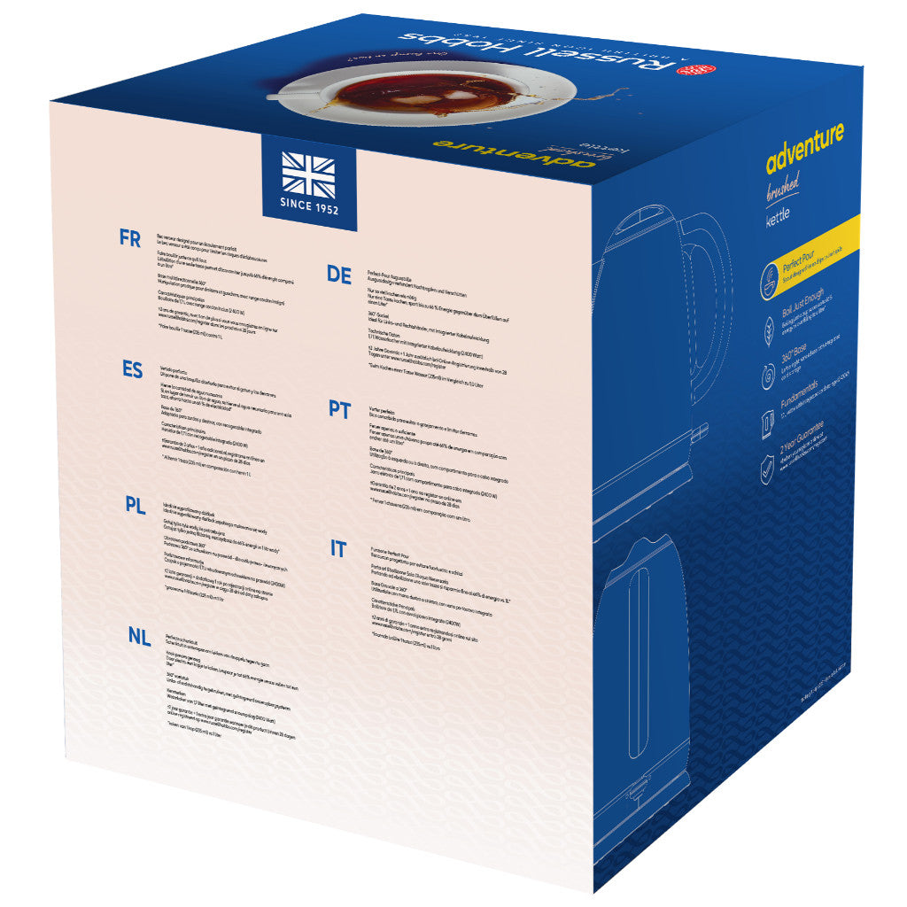 Dry-run/ overheating protection, automatic boiling stop and manual switch-off option, internal water level indicator.
